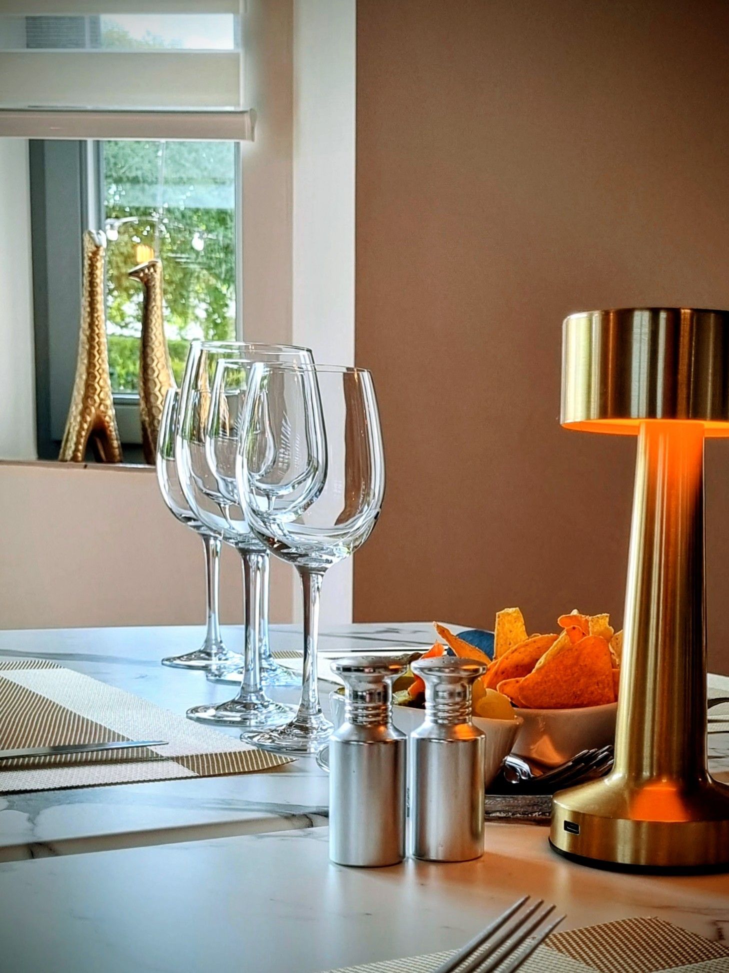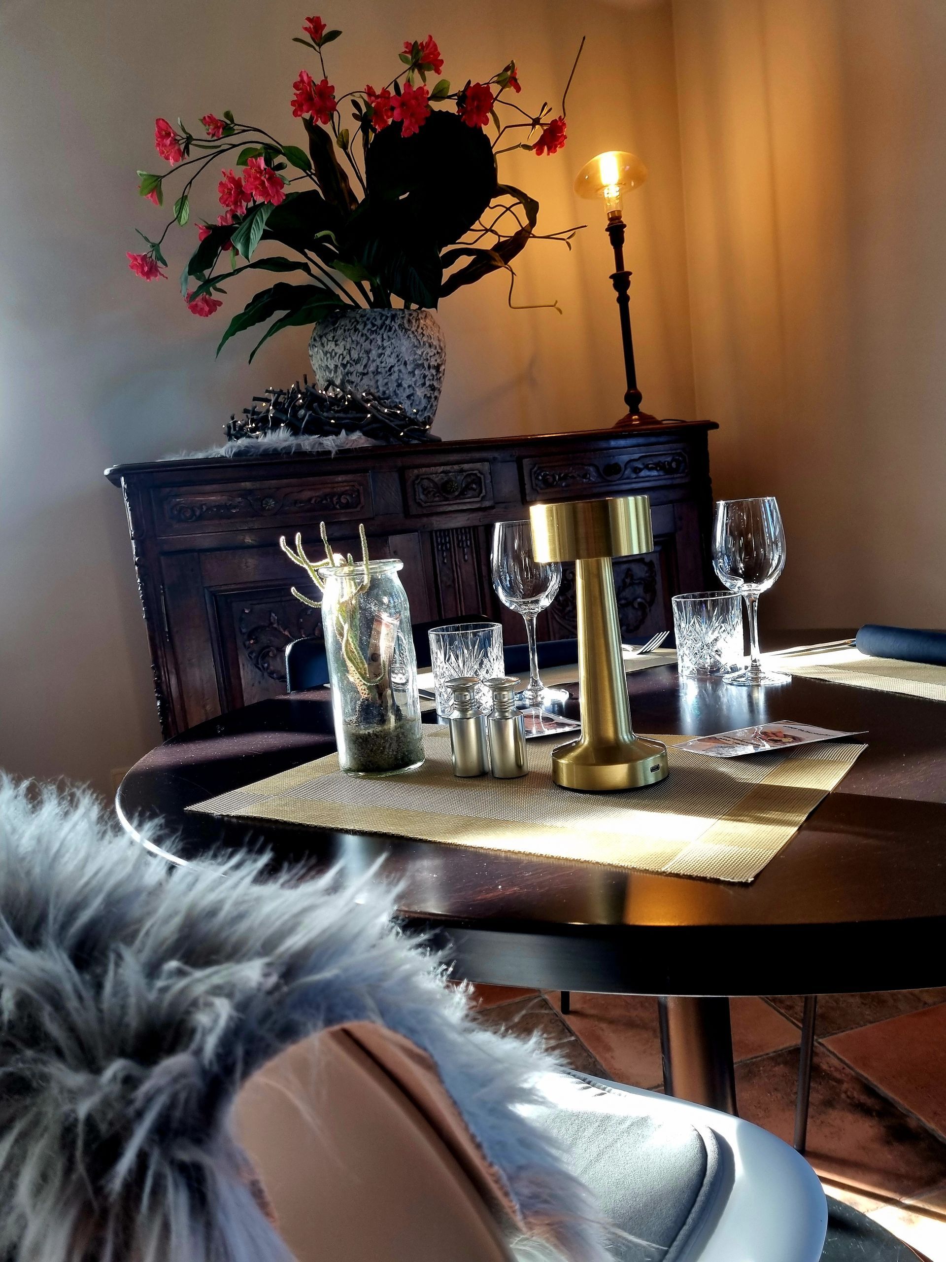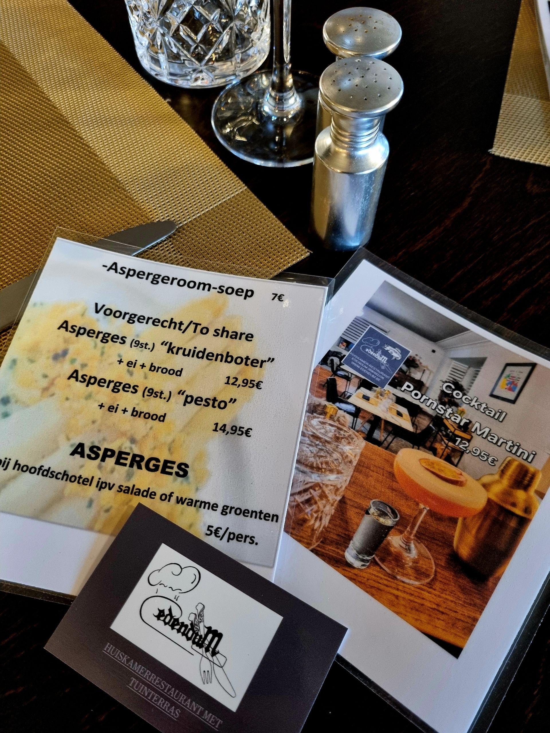 Sfeervol huiskamer-restaurant met tuinterras te Bocholt, met gastvrouw Christel aan het fornuis en gastheer Bart voor de bediening.